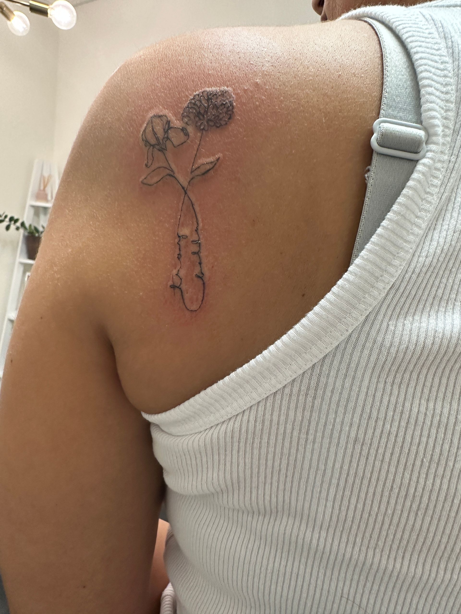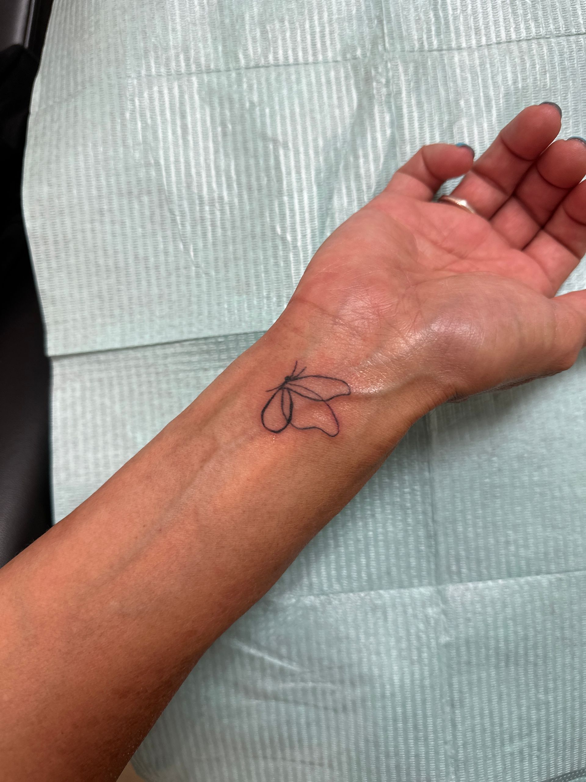 Fine Line tattoos are done right beneath the upper dermis layer, which can allow the tattoo to fade and may need a touch up . These tattoos are done with a single needle or a 3 needle and lines may not be perfect compared to a traditional body tattoo with thicker lines and shading. DESIGN MUST BE APPROVED BEFORE BOOKING